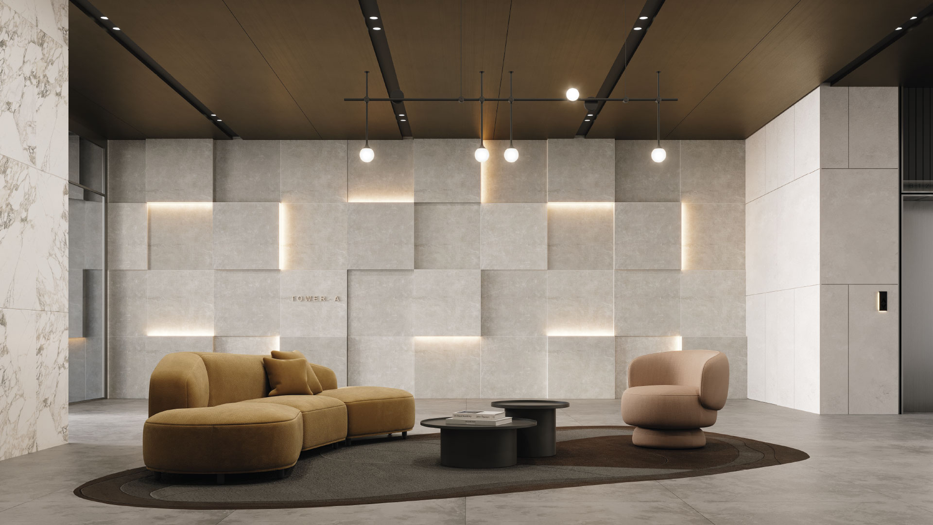 The stunning lobby of RiverQuay welcomes residents and visitors into a world of luxury and sophistication. Adorned with designer sofas and plush armchairs, it exudes an air of opulence and comfort, inviting visitors to wait in style. As a focal point, a stunning wall feature with integrated ambient lighting serves as a captivating centrepiece, casting a warm and inviting glow throughout the space. Feature pendant lighting is also present, glimmering against the metallic ceiling creating an instant impression.