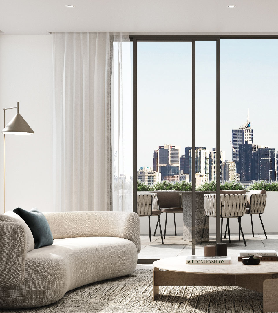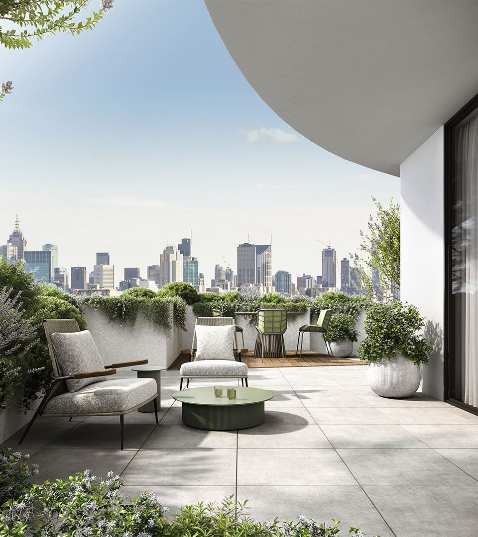 Situated only moments from the Melbourne CBD, just across the beautiful Maribyrnong River, Select residences are granted glorious views of the City skyline, Flemington Racecourse and the winding riverway. Large expanses of glass allow natural sunlight to filter throughout internal spaces, enlivening each home and framing picturesque views of the surrounds.